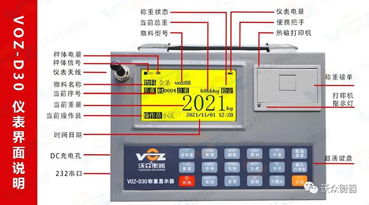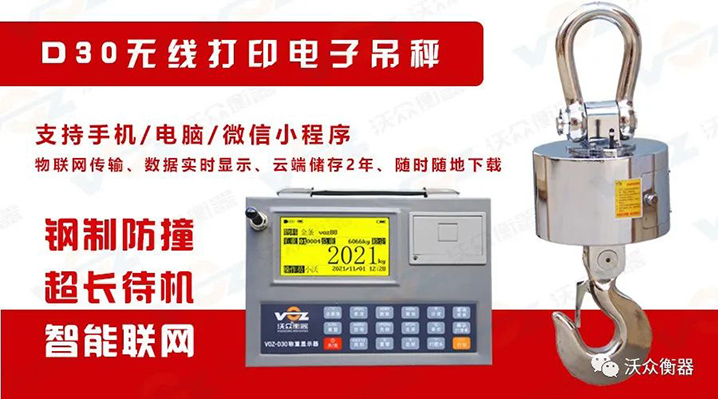 VOZ-D30系列電子吊秤量程:3t~100t(注:高噸位需要定制),性能指標(biāo)符合國際OIML 級秤標(biāo)準(zhǔn),適用于冶金、鐵路、倉儲、港口、工礦企業(yè)等各種計量場合。